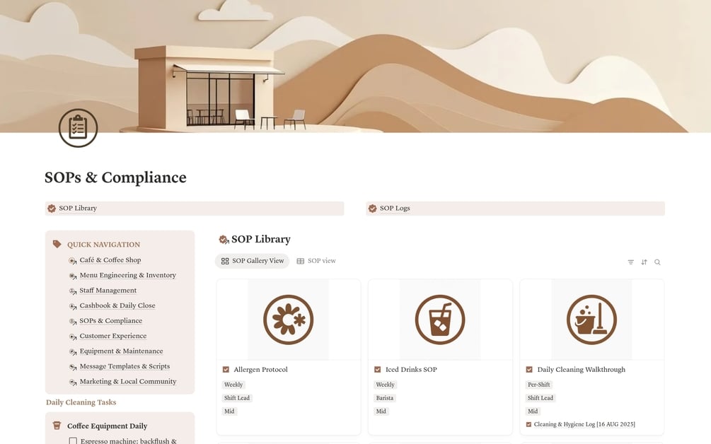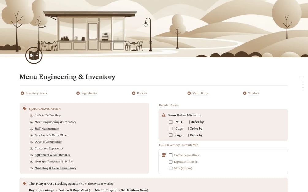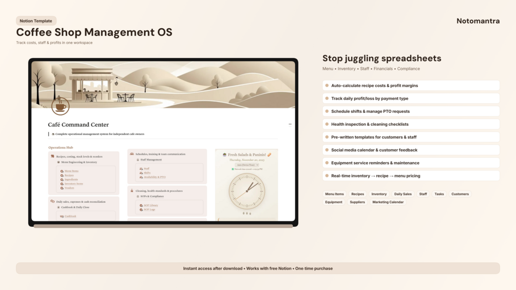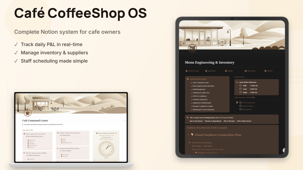 Cafe & Coffee Shop OS puts your entire operation in one Notion workspace. Menu costing, daily financials, staff scheduling, inventory, SOPs, marketing. All connected. All calculated. All finally under control.