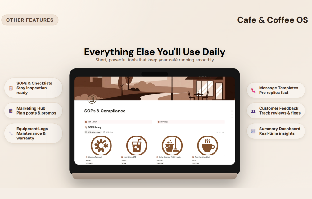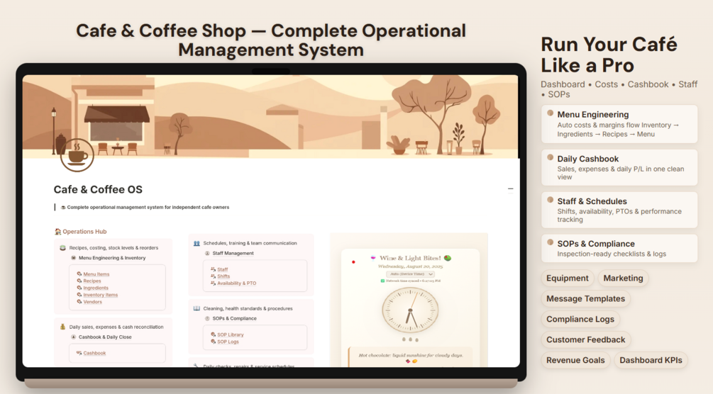 Built by real café industry professionals using proven workflows. Not just another template — this is a complete operating system that scales with your business.