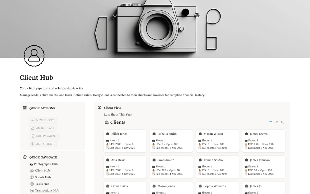 Photography Business OS puts your entire operation in one Notion workspace. Clients, shoots, invoices, tasks, gear, locations, team, calendar. All connected. All calculated. All under control.