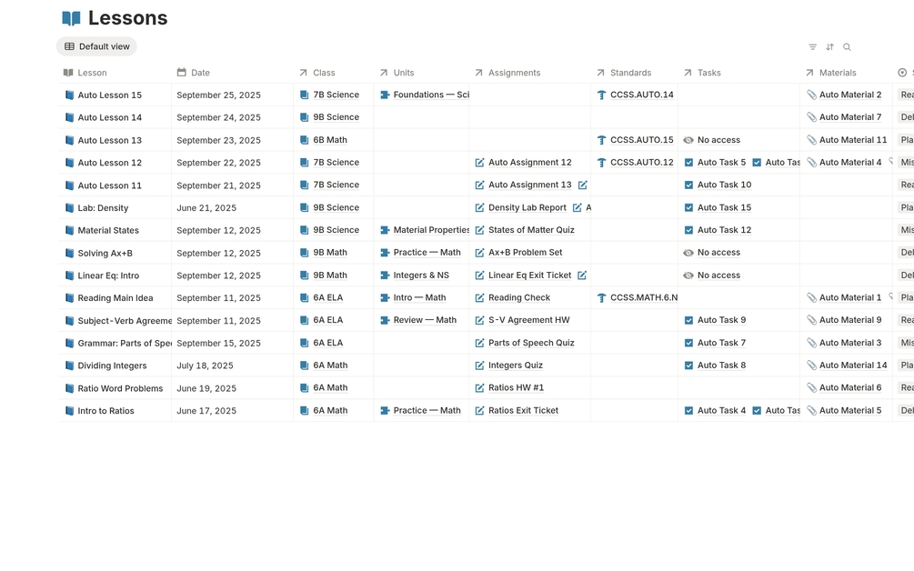 Use the lesson planner to prepare upcoming classes, create new assignments, and review student progress. The template shows you exactly what's coming up and what needs attention.