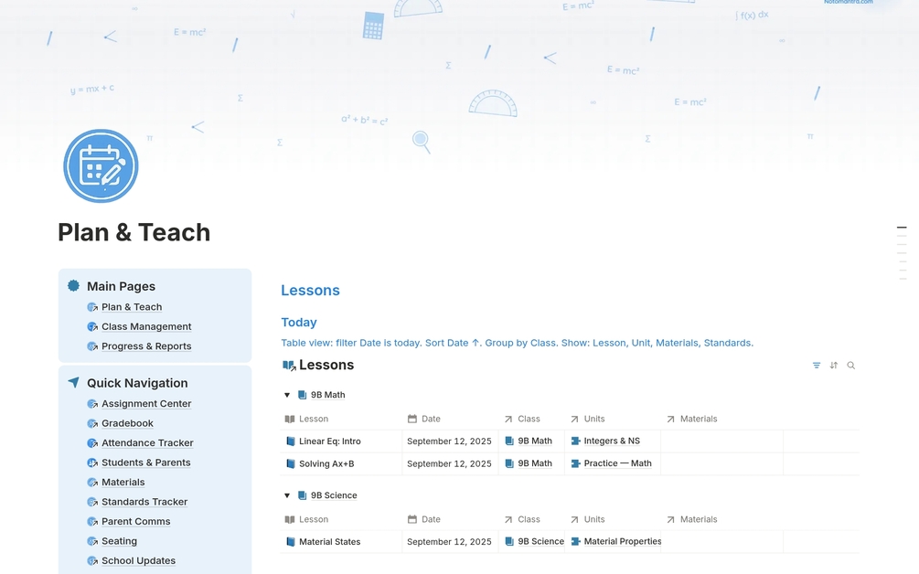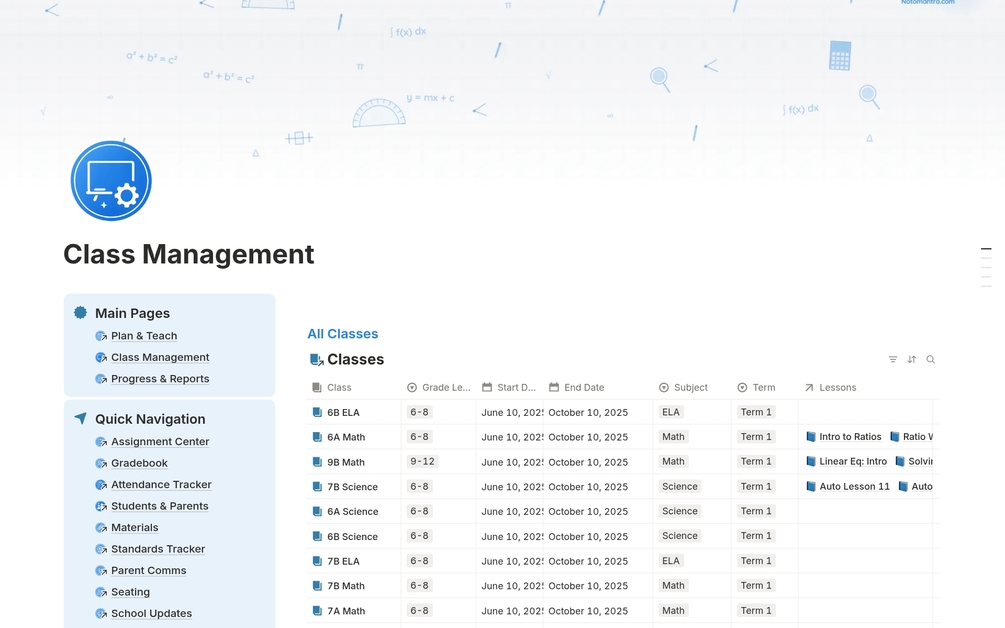 A comprehensive Notion template that helps teachers manage lessons, track student progress, handle grading, and communicate with parents - all in one organized workspace.